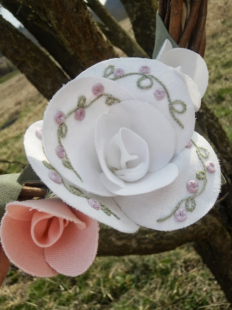 Rose di stoffa sulla ghirlanda da appendere alla porta di casa